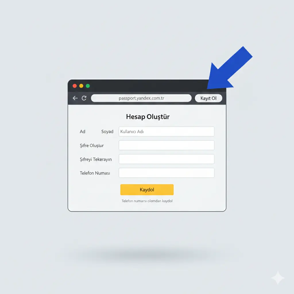 İlk olarak, web tarayıcınızın adres çubuğuna mail.yandex.com.tr yazın ve Enter tuşuna basın. Açılan sayfada, sağ üst köşede veya sayfanın ortasında “Giriş Yap” butonunun altında “Hesap Oluştur” ya da “Kayıt Ol” seçeneğini göreceksiniz. Bu butona tıklayın.