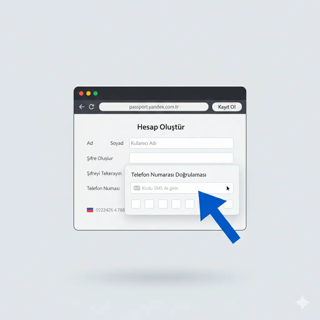 Telefon numaranızı girdikten sonra, “Kaydol” butonuna tıkladığınızda Yandex, belirttiğiniz telefon numarasına bir doğrulama kodu gönderecektir. Bu kodu ilgili alana girin. Bu, hesabınızın size ait olduğunu teyit eder ve spam hesapların oluşturulmasını engeller.